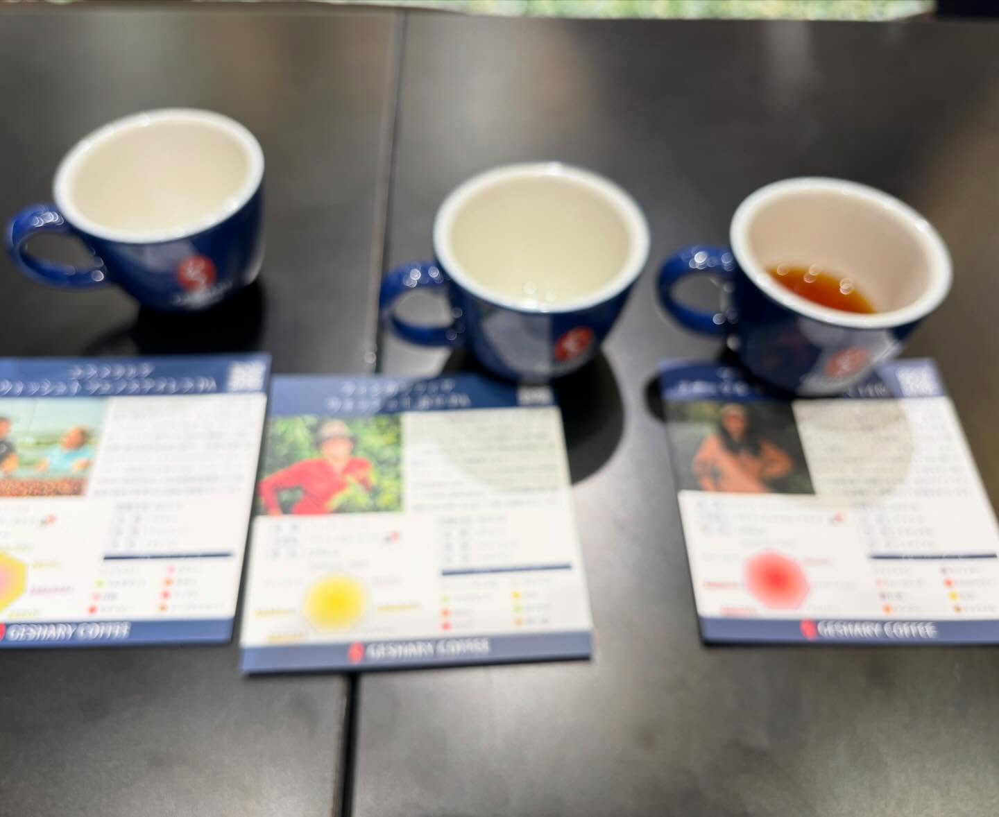 ボケまくりの写真ですが、ゲイシャの飲み比べです。30グラム4万弱のヤツ(右のヤツね)は水出しで冷えててもいい香り〜♪ 飲み比べセットは2500円なり。